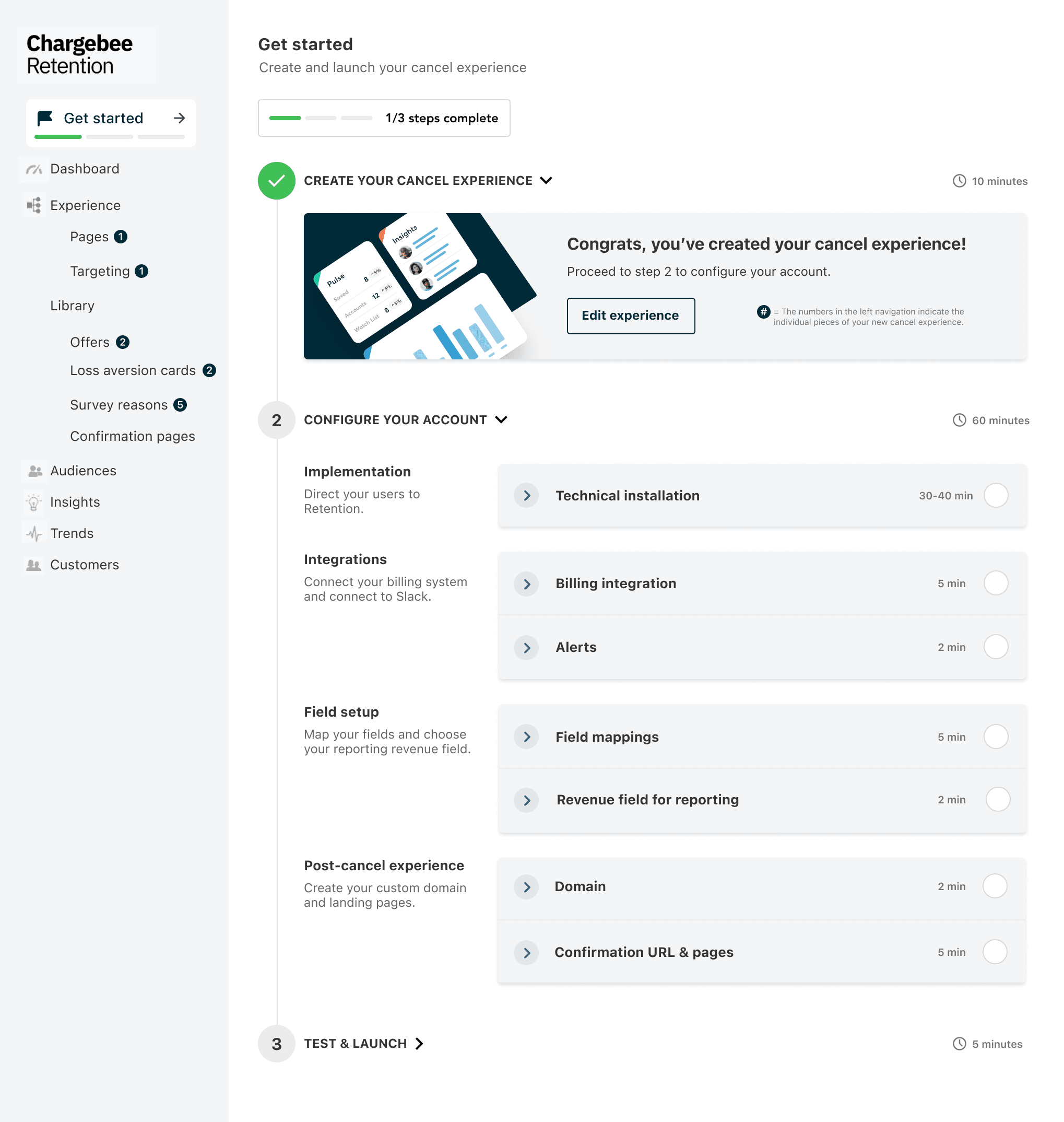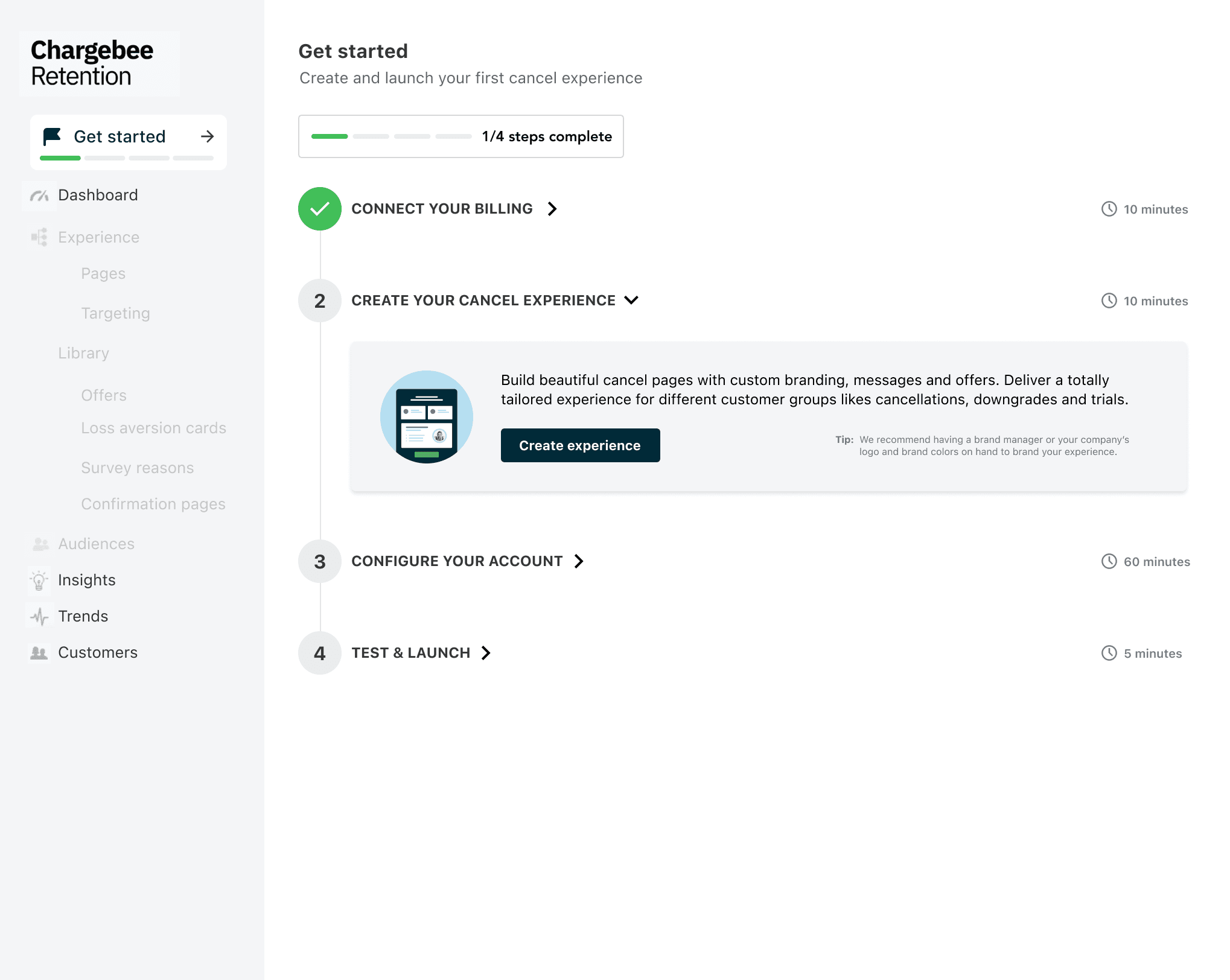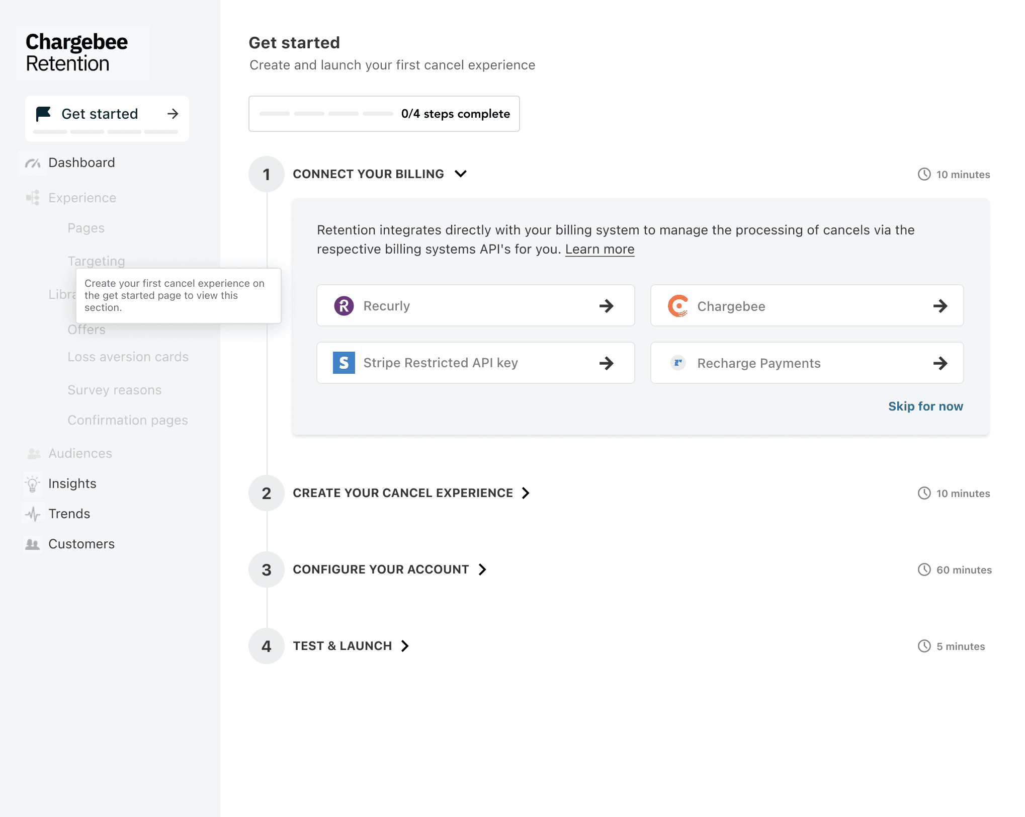 I designed the guided onboarding experience to help new customers quickly activate key retention features. The onboarding flow walks users through creating their first cancel page, launching their first offers, and integrating Chargebee with their website, reducing setup friction and accelerating time-to-value. Full case study available upon request.