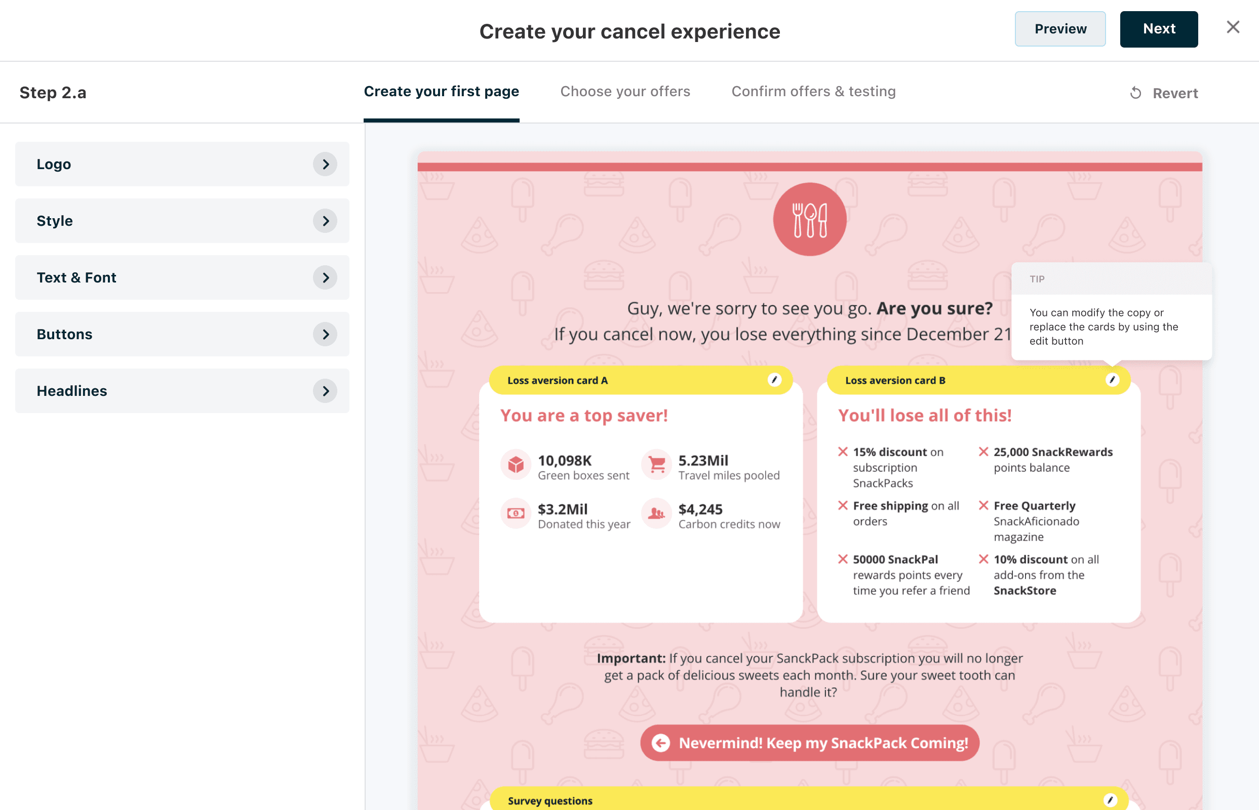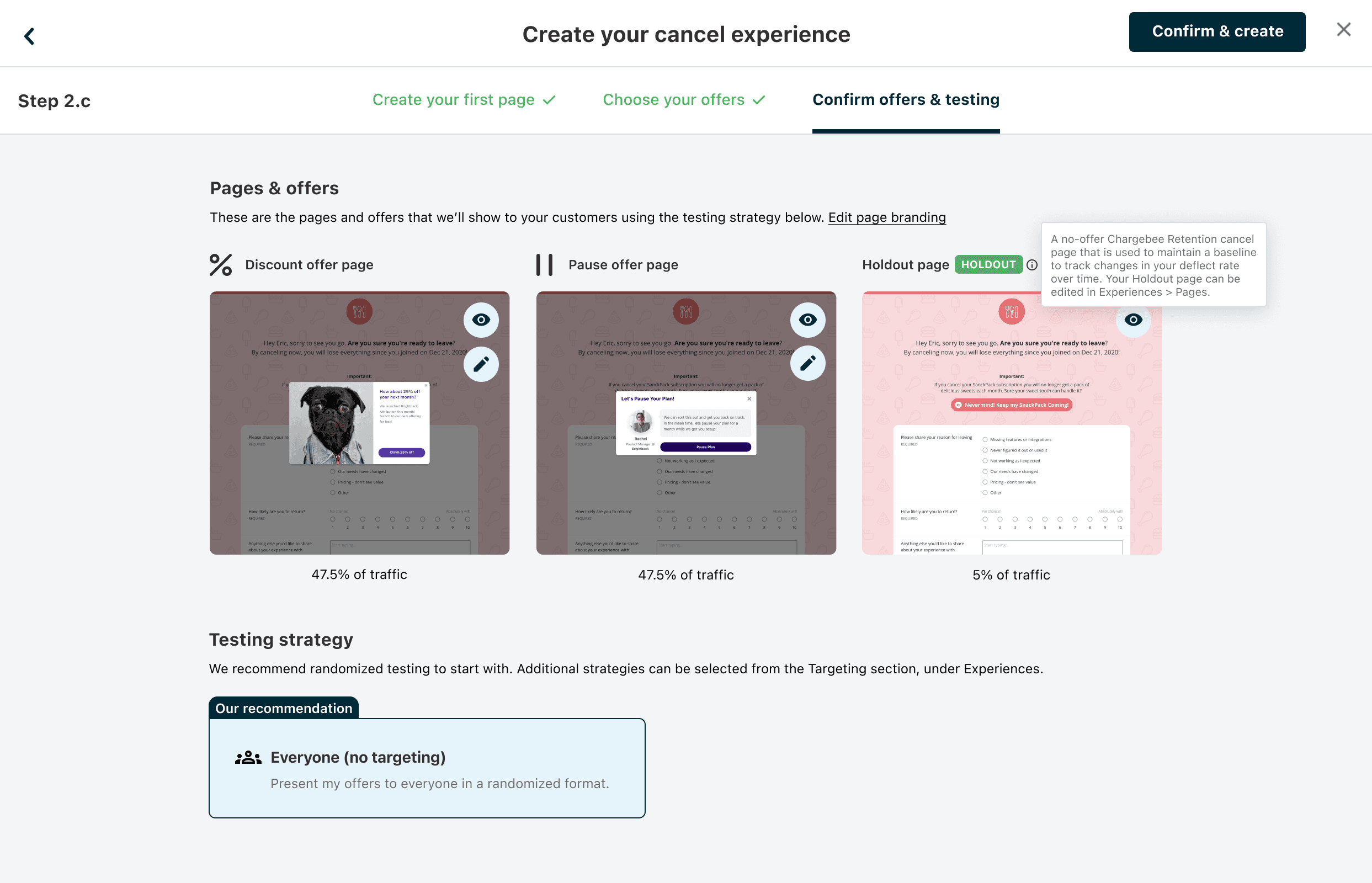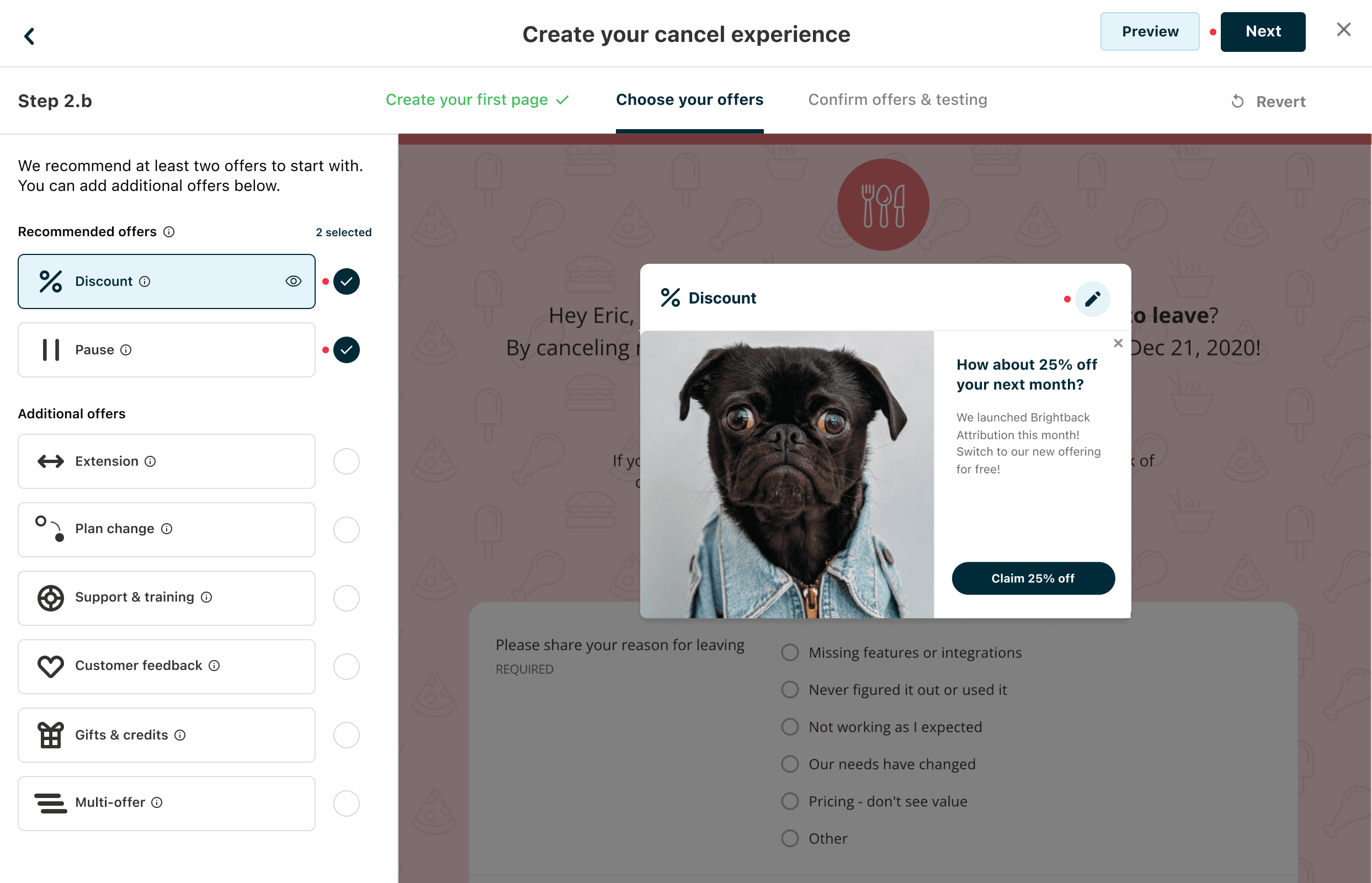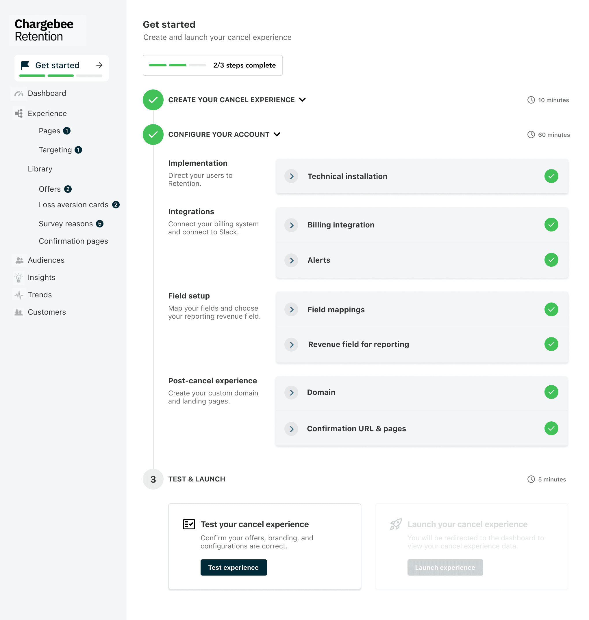 I designed the guided onboarding experience to help new customers quickly activate key retention features. The onboarding flow walks users through creating their first cancel page, launching their first offers, and integrating Chargebee with their website, reducing setup friction and accelerating time-to-value. Full case study available upon request.